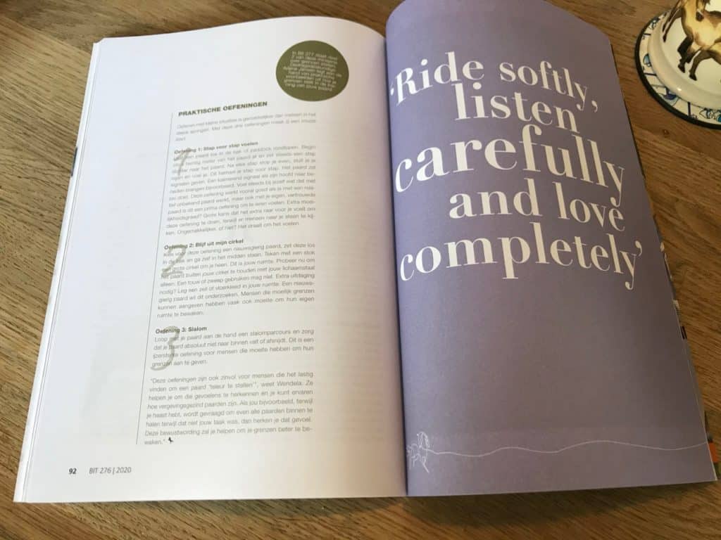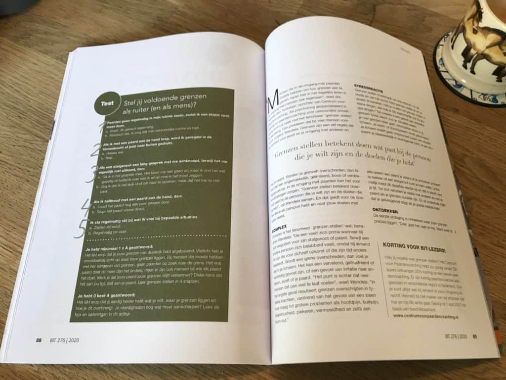 Deze maand verscheen er in BIT Magazine (paardentijdschrift) een uitgebreid interview met Wendela den Tonkelaar over het onderwerp Grenzen stellen. Het artikel bevat een kort testje, een vier stappen plan om beter te leren grenzen te stellen, achtergrond informatie over hoe het komt dat zoveel mensen met dit thema worstelen en drie praktische oefeningen die je met je eigen paard kan uitvoeren.